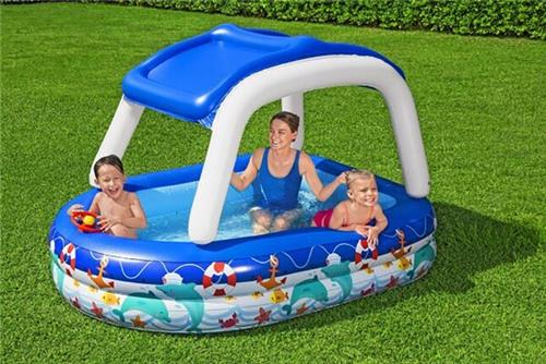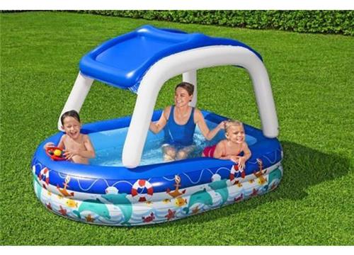 Dit blauwe zwembad is voorzien van een overkapping, waardoor schaduwrijk plezier gegarandeerd is tijdens het zwemmen. Met een afmeting van 213 x 155 x 132 cm is er genoeg ruimte om te spelen en te spetteren, terwijl het duurzame PVC-materiaal zorgt voor langdurig gebruik. De Sea Captain is ontworpen door Bestway, een gerenommeerd merk op het gebied van zwembaden en accessoires.