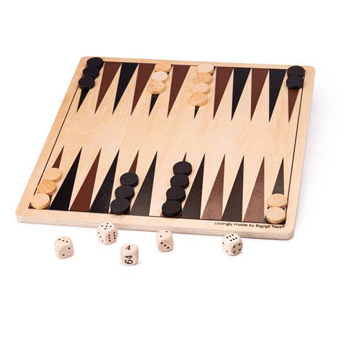 Backgammon is een traditioneel houten bordspel voor twee spelers. Elke speler heeft 15 chips die over het bord verschoven worden aan de hand van de dobbelstenen. Inhoud: 30 speelstukken en een spelbord. Gemaakt van hout en geschikt voor kinderen vanaf 3 jaar oud.