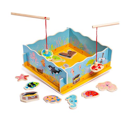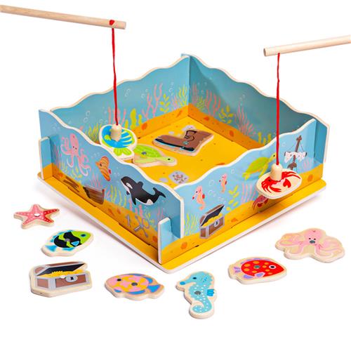 Grijp je hengel voor wat puzzelplezier! Deze kleurrijke houten vissen kunnen aan de magnetische hengel worden gehaakt en, eenmaal veilig bevestigd, weer op het houten bord worden neergelaten. Vereist vaardigheid en concentratie om elke vis te vangen. Helpt bij het ontwikkelen van behendigheid en coördinatie. Gemaakt van hoogwaardige, verantwoorde materialen. Voldoet aan de huidige Europese veiligheidsnormen. Wie vangt de meeste zeedieren? Het Houten Magnetisch Visspel bestaat uit een houten ondergrond, 4 zijkanten, 10 zeefiguurtjes en 2 magnetische hengels. Zet het water in elkaar en vangen maar met het Houten Magnetisch Visspel!