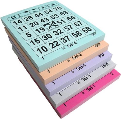 Bingo kaarten gekleurd - Bingo block - 5x100 vellen - 0 tot 75 - 5 verschillende series