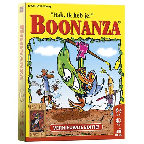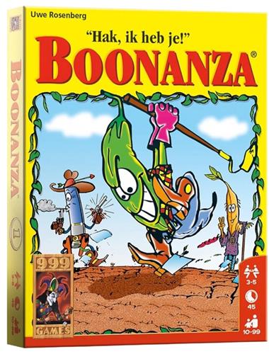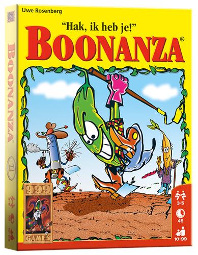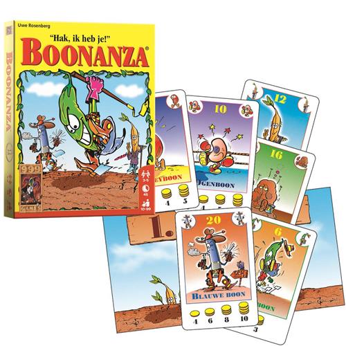 In dit communicatieve kaartspel Boonanza handelen de spelers met hun bonen en verbouwen deze op hun akkers. Wie troggelt de andere spelers de beste bonen af en verdient het meeste geld? Iedere speler krijgt 5 bonenkaarten en moet deze op volgorde in zijn hand houden. Verder heeft iedere speler twee bonenvelden. Op elk daarvan mag hij één soort bonen verbouwen. Als je aan de beurt bent, moet je de eerste kaart en mag je de tweede kaart uit je hand verbouwen. Daarna draai je twee nieuwe bonenkaarten open die je mag houden of verhandelen. Je mag ook kaarten uit je hand verhandelen. Dat kan nuttig zijn, want een bonenveld is meer waard als er meer kaarten van een soort op liggen. En als je een soort moet verbouwen die er niet ligt, moet je een ander verkopen. En dat kan wel eens te vroeg komen... Je kunt er per spel echter wel één keer voor kiezen om voor drie thalers een extra bonenveld te kopen. Het spel is afgelopen als de stapel bonenkaarten drie keer is doorgespeeld. Wie daarna het meeste geld heeft, wint.
