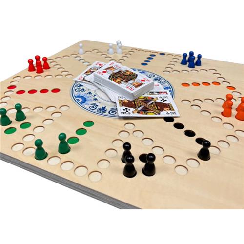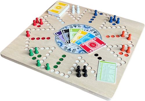 | Verpakkingsinhoud | Houten dubbelzijdig spelbord, spelregels, 24 houten pionnen, 78 speelkaarten |