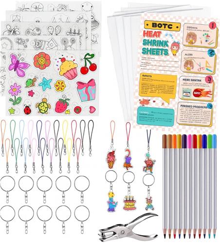 Met de BOTC Krimpfolie set van 200-delig kunnen kinderen en gezinnen eindeloos knutselen en creatief bezig zijn. Deze set is perfect voor het maken van prachtige sieraden en unieke sleutelhangers. De set bevat 15 stuks kunstpapier, waarvan 5 patronen bevatten, een perforator, 12 kleurpotloden en 20-25 sleutelhangerriemen.