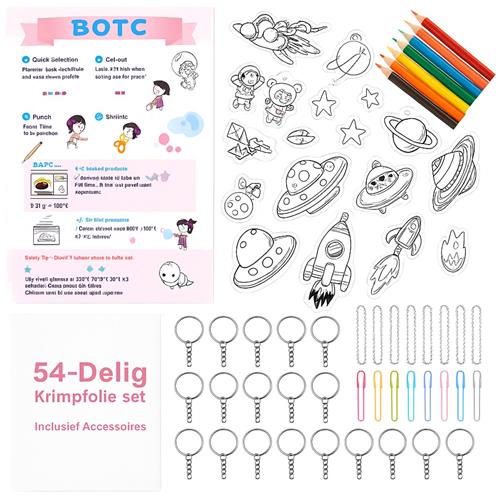 De krimpfolies zijn heel eenvoudig in gebruik. Kinderen kunnen hun favoriete kunstwerk tekenen, dit uitknippen, bakken en zien hoe het krimpt tot een uniek en persoonlijk ontwerp. Aanbevolen voor kinderen vanaf 6 jaar, met toezicht van een volwassene tijdens het bakproces. Zo kunnen ze samen genieten van de creatieve knutselmomenten met de BOTC Krimpfolie set.