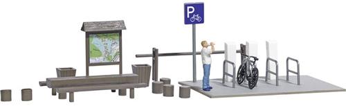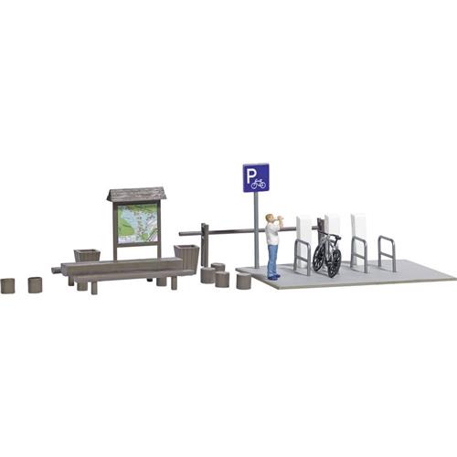 De set omvat een E-bike, een fietsenstalling met drie laadzuilen, vier ophangbeugels, een schild en een houten tafel met twee banken. Daarnaast vindt u ook zes houten potloden, een overdekt bord en een houten sluis, samen met twee afvalmanden, die samen een prachtige omgeving voor uw fietsroute creëren. Het assortiment zorgt voor eindeloze mogelijkheden in uw modelbouwproject.