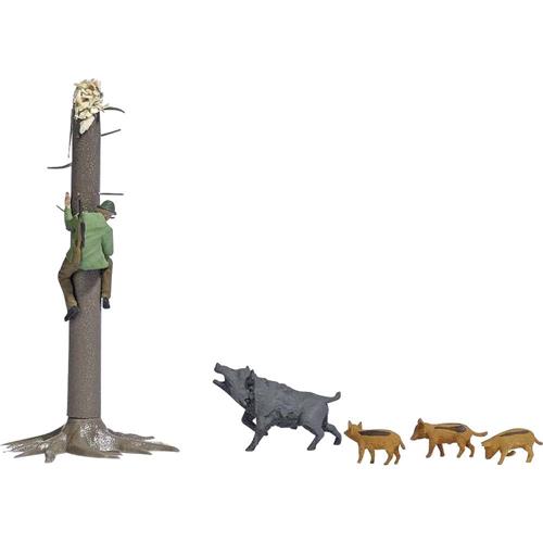 De set bevat een actiescène waarin een groep wilde zwijnen, bestaande uit een zeug en haar 3 biggen, een jager achtervolgen. De jager heeft zichzelf 'gered' door in een boomstam te klimmen. Deze toevoeging zorgt voor een dynamisch en realistisch element in jouw modelwereld.