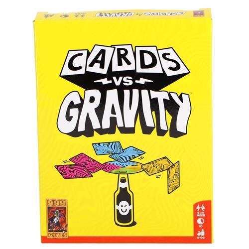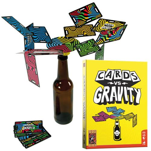 In Cards vs Gravity balanceer je kaarten op een fles. Een magnetische schijf houdt de boel redelijk lang in evenwicht. Elke beurt pak je een kaart en steek je die in een kaart van dezelfde kleur of hang je die eraan. Valt er niets, dan is de volgende speler aan de beurt. Vallen er wel kaarten van de fles, dan krijg je daar strafpunten voor. Wie aan het einde van het spel de minste strafpunten heeft, verslaat niet alleen de zwaartekracht, maar ook zijn medespelers!