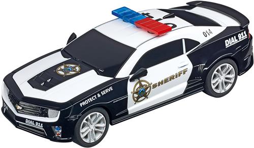 De Carrera GO!!! Chevrolet Camaro "Sheriff" racebaanauto is een opvallende verschijning die zowel snelheid als rechtvaardigheid belichaamt. Met zijn gedetailleerde ontwerp en opvallende zwart-witte kleurenschema ziet deze politieauto er niet alleen stoer uit, maar is hij ook nog eens extreem snel. Hij is perfect voor spannende achtervolgingen op de Carrera racebaan.