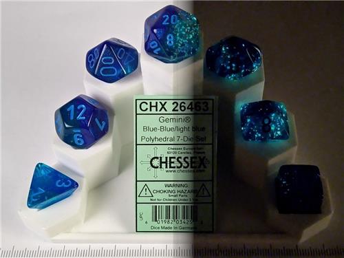 - Bij Spelhuis kun je Chessex 7-Die set Gemini - Blue-Blue/Light Blue kopen voor de prijs van € 11,99. Dit is vandaag de goedkoopste webshop.