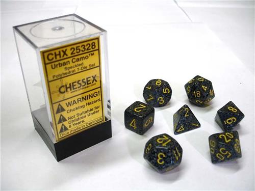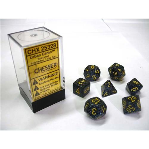 - Bij Spelhuis kun je Chessex Urban Camo Speckled Polydice Dobbelsteen Set (7 stuks) kopen voor de prijs van € 6,99. Dit is vandaag de goedkoopste webshop.