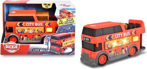 De City Bus van het merk Dickie is een kunststof speelgoedvoertuig dat werkt op batterijen. Met een schaal van 1:24 is deze stadsbus gedetailleerd en realistisch. De bus heeft een afmeting van 15.5 cm breed, 8 cm hoog en 6 cm lang, en weegt 130 g. Hij is voorzien van verlichting en maakt geluid, waardoor het spelen nog leuker wordt voor kinderen tussen de 3 en 6 jaar oud.