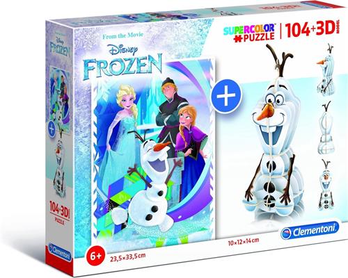 Met de Clementoni 104-delige legpuzzel + 3D-model van Frozen haal je een stukje magie in huis! Deze vrolijke legpuzzel brengt de geliefde Olaf uit Disney's Frozen tot leven. Laat je betoveren door de uitdagende puzzel van 104 stukjes en maak vervolgens met het bouwpakket een prachtig Olaf-figuur dat je in jouw kamer kunt neerzetten.