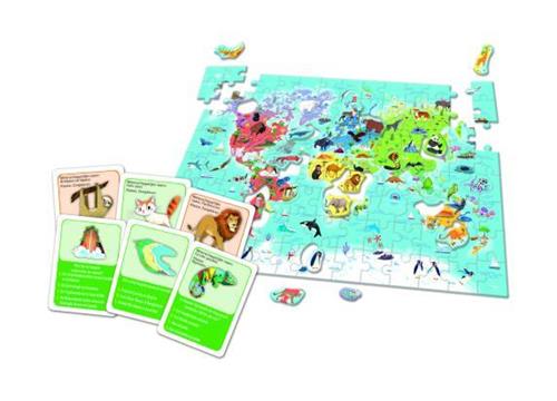 Een puzzel en vele spelactiviteiten om de dieren op aarde en hun leefomgevingen te ontdekken, en hun namen en classificatie te leren. Het spel bevat een grote puzzel van de wereld met de belangrijkste fysieke kenmerken, dierenvormen en afbeeldingen van typische vegetatie in verschillende habitats. Tevens inclusief informatiekaarten voor de classificatie van dieren. Het kind kan zich vermaken met het leggen van de grote puzzel en het passen van de dierenvormen in de juiste habitats. Verder bevat het gezelschapsspelletjes, uitdagingen, bingo en een zoekspel, om het zicht te verscherpen, het logisch denkvermogen te ontwikkelen en reflexen te trainen. Wordt geleverd in full-colour doos. Geschikt voor kinderen vanaf 6 jaar.