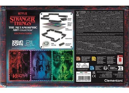Ontdek de spannende wereld van de Clementoni Puzzel - Stranger Things - Morphing Collection - Vecna! Deze prachtige puzzel bestaande uit 520 stukjes prikkelt de verbeelding van elke fan. Met zijn unieke RGB-verlichting en morphing effect, brengt deze puzzel de iconische stijl van de populaire serie tot leven. Een perfecte keuze voor zowel volwassenen als oudere kinderen die de nieuwsgierigheid van het puzzelen willen combineren met de opwinding van Stranger Things.