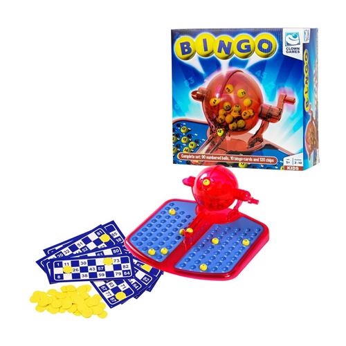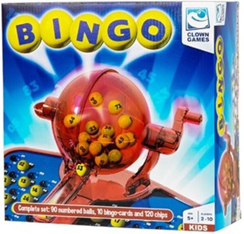 Wie roept er als eerste BINGO? Speel dit gezellige spel met jouw vrienden of familie. Met deze complete set van Clown Games heb je alles in huis! Je kunt de kaarten steeds opnieuw gebruiken, omdat je de getallen op je kaart bijhoudt met een fiche. Spannend: heb jij het snelst een rij vol, of misschien wel de hele bingokaart? Inhoud: bingomolen, controlebord, 90 genummerde ballen, 10 bingokaarten en 120 fiches. Wordt geleverd in full-colour doos. Geschikt voor 2 tot 10 spelers vanaf 5 jaar.