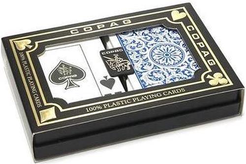 Copag Jumbo index double deck. Originele Copag pokersize poker kaarten, 100% Plastic. Speelkaarten voorzien van Jumbo index en per twee decks (pakjes) rood & blauw verpakt in kunststof cassette. Copag pokerkaarten zijn uitermate flexibel en worden veel gebruikt in casino's (met name in pokerrooms). Copag staat in reviews van gerenommeerde sites steevast in de top, al dan niet geheel bovenaan vanwege de vele goede eigenschappen die deze speelkaart bezit. Zo komen ze met de buigtests als meestal als beste uit de bus, en met de breaktest (waarbij kaarten tientallen keren tegen muren/planken worden gegooid) zelfs als beste. Al met al absolute topkwaliteit speelkaarten met een prima prijs/kwaliteitverhouding. Onze aanrader voor iedereen die een goede plastic speelkaart zoekt! Fabrikant: Copag Formaat: 63 x 88 mm. Index: Regular, 2 pips Materiaal: 100% plastic PVC Inhoud: 2 x 52 speelkaarten verpakt in kunststof opbergcassette voorzien van Copag logo.