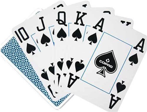 | Verpakkingsinhoud | Een mooie pokerkaart van hoogwaardige kwaliteit met een jumbo index voor extra duidelijkheid op alle tafels en in alle omstandigheden, ideaal voor de pokerspeler en kaartliefhebber. COPAG wordt beschouwd als dé ultieme pokerkaart. Doordat deze kaarten van 100% PVC plastic zijn gemaakt, zijn ze beter bestand tegen gebruikssporen, in tegenstelling tot kartonnen speelkaarten. Probeer je een COPAG kaart te plooien, springt deze terug naar haar oorspronkelijke kaarsrechte vorm, zonder markeringen te vertonen. |