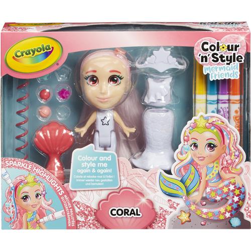 Met de Crayola Colour'n'Style vriend Coral haal je eindeloos speelplezier in huis! Deze kleurrijke set stelt je in staat om de Coral Zeemeermin volledig naar eigen wens te stylen en te kleuren. Laat je creativiteit de vrije loop en zorg telkens voor een nieuwe look voor Coral. Het kleuren van de stiften kan variëren van de afbeelding, waardoor elke creatie uniek wordt.