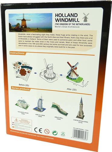 Deze realistisch ontworpen puzzel is een geweldige toevoeging aan je collectie en ziet eruit als een miniatuur Nederlandse windmolen. Geen gereedschap of lijm is nodig, waardoor het geschikt is voor puzzelaars vanaf 8 jaar. De puzzel is verpakt in een mooie doos, eenvoudig om cadeau te geven aan een puzzel- of Nederlandse icoonliefhebber.