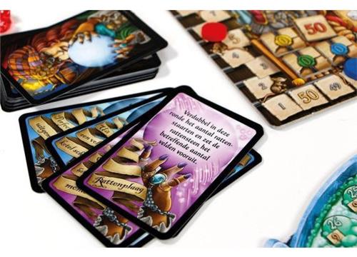 | Verpakkingsinhoud | Inhoud: 4 ketels 1 scorespoor met rondenspoor 12 ingrediëntenboeken 24 waarzeggerijkaarten 4 flessen 4 buidels 20 robijnen 1 bonusdobbelsteen 219 ingrediëntenfiches 4 fiches 0/50 zegels 1 rondeteller 8 druppels 4 scorestenen 4 rattenstenen 1 ingrediëntenalmanak de spelregels |