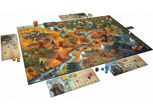 | Verpakkingsinhoud | Inhoud: 1 tweezijdig bedrukt speelbord 41 speelstukken op kunstoffen voetjes 4 heldentableaus 1 uitrustings/gevechtstableau 142 kartonnen onderdelen 72 grote speelkaarten 66 kleine speelkaarten 20 dobbelstenen 9 markeerschijven 5 markeerstenen 1 verteller 1 toren 15 sorteerbuidels 1 bijlage de spelregels |