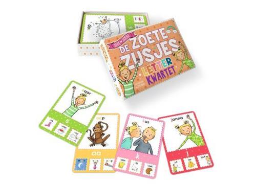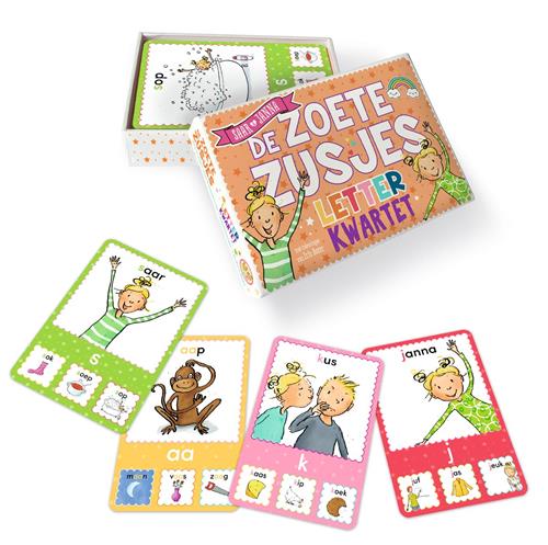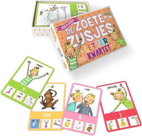 Het 'Zoete Zusjes Letterkwartet' is een gezellig en leerzaam spel voor kleuters die dol zijn op letters. Met 32 stevige kaartjes, ontworpen door Hanneke de Zoete, kunnen kinderen vanaf 4 jaar op een speelse manier oefenen met letters en woordjes. Het kwartetspel kan gespeeld worden met letters, woorden, afbeeldingen en kleuren, waardoor het divers en educatief is. Zoek de kwartetten bij elkaar en beleef uren speelplezier met dit vrolijke spel van de Zoete Zusjes Saar en Janna.