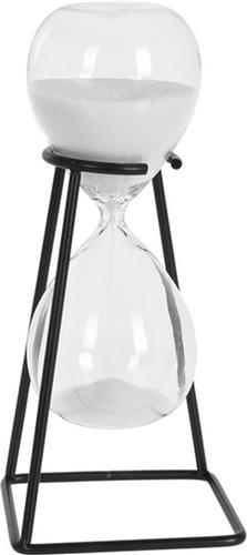 Een stijlvolle toevoeging aan je interieur is deze decoratieve zandloper in het wit met een metalen standaard van 25 cm hoog. De glazen zandloper heeft wit zand en rust op een zwarte metalen houder. Met een formaat van 23 cm voor de zandloper en 13 x 13 x 25 cm voor de standaard, is dit een opvallend decoratiestuk. De looptijd van de zandloper is ongeveer 30 minuten, al kan dit iets variëren vanwege de decoratieve aard. Deze zandloper behoort tot de woonaccessoires en woondecoraties van glas en past perfect in een moderne interieurstijl.