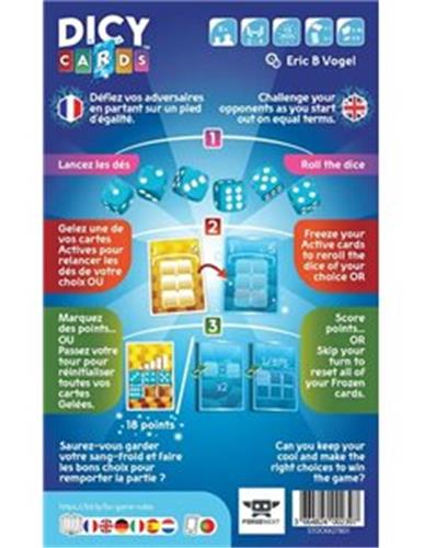 De Dicy Cards doos bevat 6 dobbelstenen, 48 kaarten (elke met een actieve en een bevroren zijde), een startspelerkaart en een scoreblok. De spelregels zijn beschikbaar in het Nederlands, Frans, Engels en Duits, waardoor het spel toegankelijk is voor een breed publiek. Met een compact formaat en lichtgewicht verpakking (0,34 kg) is het ook ideaal voor op reis.