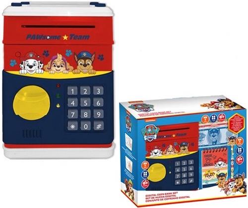 Deze Paw Patrol spaarpot kluis is geschikt voor alle soorten munten en briefgeld. De kluis is zelfs voorzien van een automatische biljetten inname. De kluis werkt met een pincode en geluidseffecten. Inclusief speelgoedmunten en biljetten. Voor de echte Paw Patrol fan. Inclusief speelgoedmunten en biljetten. Met pincode en geluidseffecten. 3 x AA batterijen niet inbegrepen.