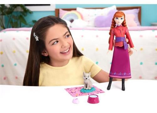 Ontdek de betoverende Disney Frozen Anna Pop en Wolvenjong set! In dit schattige Winterwonderland ontmoeten Anna en haar lieve wolvenvriendje elkaar. Deze modepop, geïnspireerd op de geliefde Disney franchise, komt met een schattig wolvenfiguurtje en vier accessoires om voor het wolvenjong te zorgen, waaronder een comfortabele deken, een dierenbedje, een borstel en een innovatieve omkeerbare kom voor water en eten.