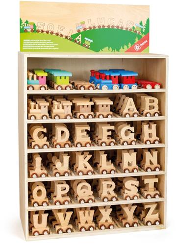 Ontdek de magie van spelen met de Lettertrein! Dit aantrekkelijke en royaal display bestaat uit een locomotief, passagierswagons en letterwagons waarmee kinderen initialen of hele namen kunnen samenstellen. Met een totale van 180 houten treinletters is het niet alleen leuk, maar ook leerzaam!