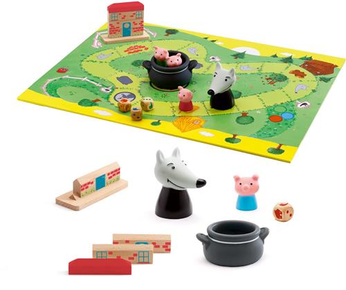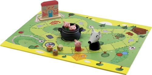 Een leuk en spannend samenwerkingsspel voor 1 tot 4 spelers vanaf 5 jaar, gebaseerd op het beroemde sprookje van de 3 biggetjes. De spelers proberen een stenen huis te bouwen om de 3 biggetjes te beschermen tegen de wolf, zodat deze ze niet te pakken kan krijgen. Bouw samen het stenen huis voordat de wolf alle biggetjes in de pan heeft gestopt! Gelukkig kunnen de biggetjes schuilen in het huisje van stro, in het huisje van hout en in het bakstenen huis. Wanneer het bakstenen huis af is en de 3 biggetjes zitten erin, is het ons gelukt en verliest de wolf. Slaagt de wolf erin alle biggetjes in te halen en in zijn kookpot te stoppen, dan is het niet gelukt en wint de wolf!