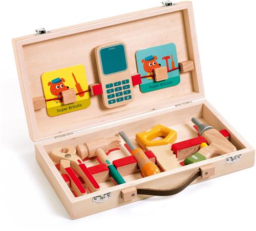 Een houten gereedschapskist boordevol Super Bricolo gereedschap voor de kleine klussers in huis! Deze set bevat een hamer, zaag, schroevendraaier, boormachine, tang en acht modelkaarten om te leren welk gereedschap bij welke situatie hoort. Dankzij de vakken in de gereedschapskist kunnen alle accessoires netjes opgeborgen worden, net als bij echte professionals. Zo ontwikkelen kinderen niet alleen hun motorische vaardigheden, maar ook hun verbeeldingskracht.