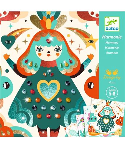 Een creatieve activiteit waarmee kinderen urenlang plezier kunnen beleven! Met de Djeco Harmony set kunnen ze 4 piratenschilderijtjes versieren met metaalfolie en strass. Door de kleurcode te volgen op de kaarten, weten kinderen precies waar ze de glanzende folie moeten aanbrengen. Dankzij het handige hulpmiddel kunnen ze eenvoudig het beschermingslaagje verwijderen en de folie op de juiste plek plakken, waarna het als magie blijft kleven!