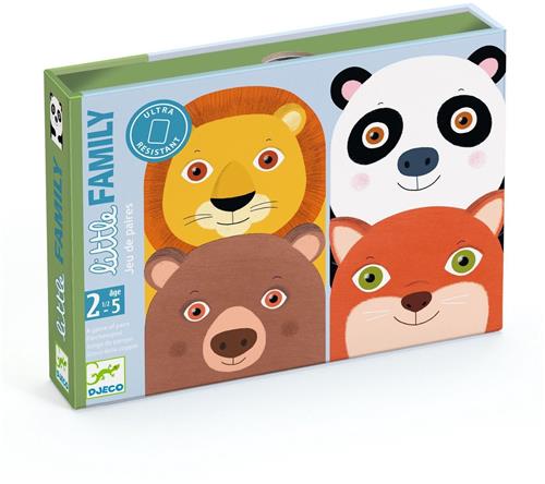 Kaartspel van DJECO voor peuters vanaf 2.5 jaar. De speelkaarten van het Little family spel zijn waterafstotend en flexibel, speciaal voor de allerkleinsten. Een leuk spel om samen te spelen. Om dit spel te winnen vorm je zoveel mogelijk dieren paren. Iedere speler krijgt 4 dierenkaarten en legt deze zichtbaar op tafel. De overige kaarten leg je gedekt op tafel. Is het jouw beurt? Dan pak je een kaart van tafel. Kun je een paar vormen met 1 van jouw kaarten of die van een tegenspeler? Dan is het dierenpaar voor jou! Het spel zit in een stevig luciferdoosje met 30 herkenbare dierenkaarten om 15 paren te vormen. Formaat kaarten 9.5 x 7 cm. Leeftijd 2.5-5 jaar. Spelduur 10 minuten.