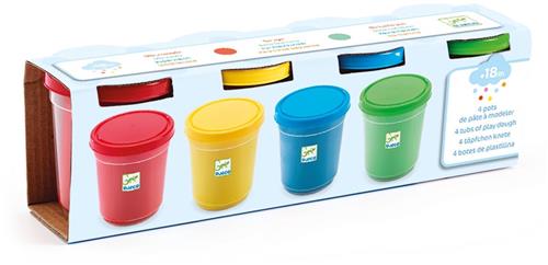 Djeco brengt met trots deze set van 4 potjes extra zachte klei voor kinderen vanaf 2 jaar. Elke pot bevat 140 gram klei in 4 basic kleuren: rood, geel, blauw en groen. De klei is verpakt in afsluitbare plastic bakjes, waardoor het lang vers blijft.