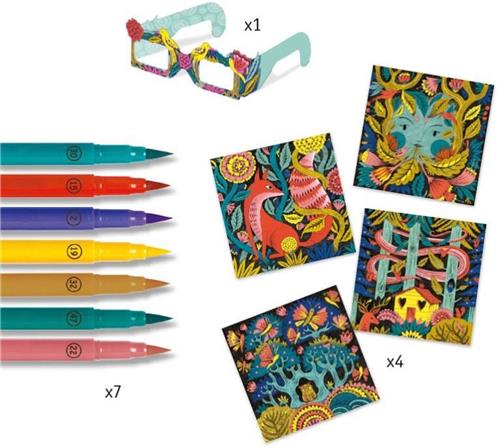 Breng je creativiteit tot leven met het unieke DJECO knutselpakket, Kleuren met 3D-effect Fantasy Forest! Dit bijzondere setje laat je kennismaken met een fantasierijke wereld vol wonderlijke dieren. Met de stap-voor-stap instructies kleur je de vier stevige kleurplaten, ontworpen door de getalenteerde Melissa Castrillon, zorgvuldig in met de zeven bijgeleverde viltstiften. Elk detail komt tot leven dankzij het 3D-effect, dat je ontdekt door de bijgeleverde 3D-bril op te zetten. Het resultaat? Een prachtig kunstwerk dat de verbeelding prikkelt!