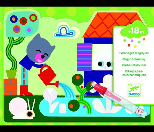Met de Djeco kleurplaten voor de kleintjes Hidden In The Garden kunnen kinderen vanaf 18 maanden zich creatief uitleven. Dankzij het magische effect ontdekken ze wat er verborgen zit in de lucht door met het waterpotlood over de witte delen te kleuren. De prachtige patronen verschijnen en veranderen van kleur, waardoor de kleurplaten telkens opnieuw tot leven komen. Deze set bevat 4 kleurplaten van zacht plastic met een verdwijnend wit vlak, een watertankpotlood en een stevige kartonnen steun, allemaal verpakt in een praktische opbergmap.