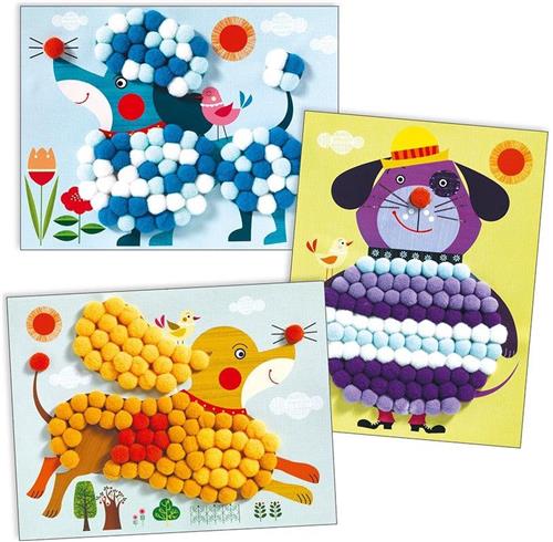 Met de knutseldoos 'Kunstwerk van pompons Aaibare hondjes' van Djeco kunnen kinderen hun eigen aaibare honden schilderijtjes maken. De set bevat 3 schilderijplaten met schattige hondenafbeeldingen en maar liefst 8 kleuren pompons, in totaal 345 stuks. Door de voorgesneden vormen eenvoudig te verwijderen en de pompons op de juiste plek te plakken, creëren kinderen prachtige en zachte hondjes om mee te pronken.