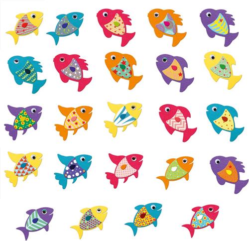 Met de Djeco knutselset "Creëren met stickers - Vissen" kunnen kinderen tussen de 3 en 6 jaar oud hun eigen zelfklevende vilt vissen versieren met puffy stickers. De set bevat 24 vilten vissen, 6 blaadjes met lichamen van vissen, 1 blaadje met bewegende ogen en 1 blaadje met decoratie. Hiermee kunnen de kinderen allerlei leuke vissen samenstellen en hun creativiteit de vrije loop laten gaan. De verpakking heeft afmetingen van 21 x 20 x 2 cm.