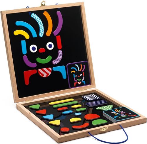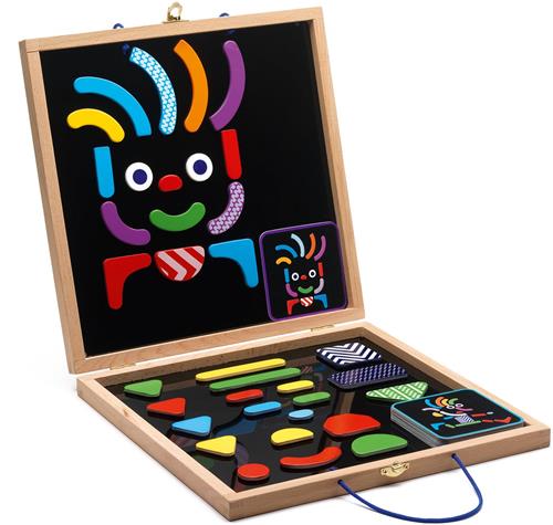 Met de Djeco Magneetkoffer Geobonhomme kunnen kinderen een leuk en uitdagend vormenspel spelen. De magnetische, houten koffer bevat 20 voorbeeldkaarten en 35 houten vormen in verschillende kleuren. Hiermee kunnen ze een van de vele voorbeelden namaken of hun eigen creaties bedenken. Dankzij de magnetische binnenzijden van de koffer met stoere zwarte achtergrond kunnen kinderen gemakkelijk hun figuren maken.