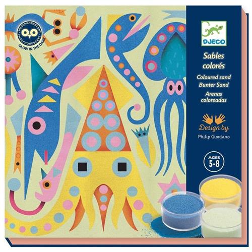 Met 12 potjes gekleurd zand, waarvan 6 glow-in-the-dark, en een slim gereedschap ontworpen door Djeco, kunnen kinderen op een knoeivrije manier aan de slag. De kartonnen prenten hebben stickerlagen die per nummer kunnen worden verwijderd, waardoor kinderen op een georganiseerde manier van donker naar licht de kleuren op de kaart kunnen aanbrengen. Na het knutselen kunnen kinderen in het donker genieten van de glow-in-the-dark elementen die oplichten.
