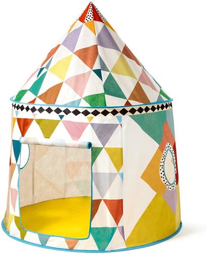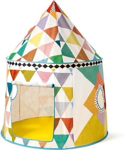 De multikleurige tent is gemaakt van duurzaam polyester en komt met houten stokken voor extra stevigheid. De tent is geschikt voor kinderen vanaf 3 jaar tot 10 jaar en is gesloten aan alle kanten, waardoor uw kind veilig en beschermd kan spelen. Daarnaast bevat de tent ramen voor lichtinval en speelse interactie.