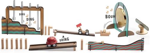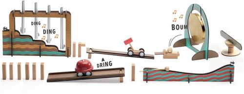 Een grote houten set met een kettingreactie-, puzzel- en bouwspel met als thema muziek en geluid. Gong en tring! Het kind volgt de 3 modellen in het boekje om zijn eigen route te bouwen of bedenkt er ontelbare andere. Dit spel voor kinderen vanaf 8 jaar is compatibel met alle sets uit de collectie om nog slimmere actie-reactie route te bedenken! Inhoud: 1 houten bouwpakket met 52 stukken, inclusief 3 metalen en 3 houten ballen. 1 verklarend boekje van 24 bladzijden inbegrepen.