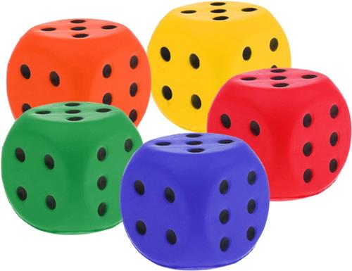 Dobbelsteen foam XL (6 cm) Set van 6 stuks (20% korting). Zachte foam dobbelstenen in 6 kleuren (oranje, groen, blauw, geel, rood en wit). Afmetingen: 6 x 6 x 6 cm. Te koop per stuk, set van 6 en set van 12 stuks.