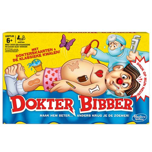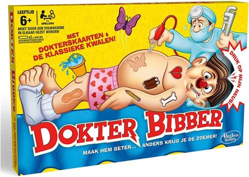 Dit is de familiefavoriet Dokter Bibber met een grappige probeerverpakking en de bekende malle kwalen. Zieke Sam voelt zich helemaal niet lekker en kids zullen het heerlijk vinden om hem te opereren en weer beter te maken. Gebruik het pincet en verwijder de 12 gekke onderdelen die ouders zich misschien nog wel herinneren – zoals een adamsappel, wensbotje en een gebroken hart. De spelers pakken een dokterskaart en opereren om die kwaal uit Sam te verwijderen. Als dat lukt zonder de zoemer te laten gaan, verdienen ze geld. De speler met het meeste geld wint. Exclusief 2x AA Batterijen. Dit product is geschikt voor kinderen vanaf 6 jaar.