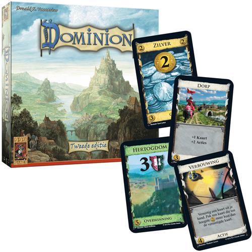 Dominion is een populair, vlot deckbuildingsspel. Dominion is één van de weinige expertspellen die je binnen een half uur kunt spelen. En heb je wel meer tijd, dan speel je gewoon meerdere partijen achter elkaar! In Dominion probeer je tijdens het spel een zo sterk mogelijk deck te formeren, zodat jij aan het einde van het spel de meeste punten hebt. De kaarten in je deck rouleren steeds van je trekstapel naar je hand, waarna ze naar je aflegstapel gaan. Als je trekstapel leeg is, schud je je aflegstapel, zodat je weer een nieuwe trekstapel hebt. Elke beurt mag je 1 actie uitvoeren en 1 aankoop doen. De verschillende kaarten in je hand helpen je daarbij of kunnen dit aantal vermeerderen. Geldkaarten vormen je kapitaal voor die beurt. Met puntenkaarten kun je niets in je beurt, maar je hebt ze uiteindelijk wel nodig om het spel te winnen. Dominion bevat puntenkaarten, geldkaarten en 25 verschillende actiekaarten. Elke beurt koop je er kaarten bij, waardoor je op jouw manier je doel kunt bereiken. Ga je voor een constructieve methode met de Smidse, het Dorp en de Markt, of probeer je het op een agressievere manier met de Dief, de Heks of de Militie? Omdat in elk spel maar 10 van de 25 actiekaarten worden gebruikt, is Dominion iedere keer weer anders. Met 7 nieuwe koninkrijkkaarten en verbeterd artwork. Bevat nu nog duidelijkere spelregels. Geschikt voor beginnende én gevorderde spelers