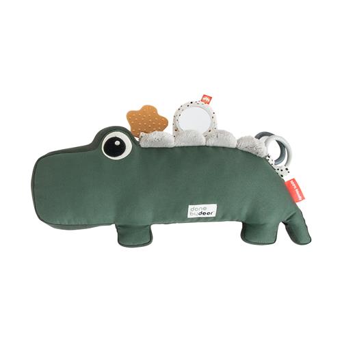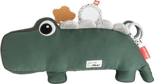 De Done By Deer Croco Activiteitenknuffel Green helpt je baby met het stimuleren van de motorische ontwikkeling en de zintuigen. De schattige knuffel beschikt over verschillende activiteiten. De baby kan zich ontdekken in de spiegel, en door op de bijtring te bijten en te kauwen wordt het tandvlees zachter en zullen doorkomende tandjes minder pijn doen. De knuffel kan aan de kinderwagen, buggy of autostoeltje bevestigd worden waardoor je kindje zich er urenlang mee kan vermaken. Verder is de Done by Deer knuffel gemaakt van hoogwaardig materiaal.