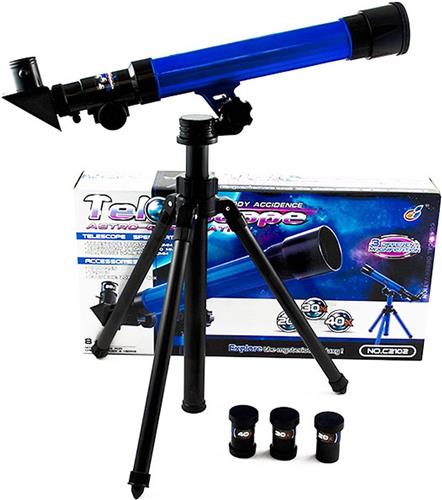 Het perfecte speelgoed voor toekomstige astronomen. Telescoop met verwisselbare lenzen van verschillende sterkte (20x, 30x, 40x). De telescoop is voorzien van een statief, met de mogelijkheid om 360 graden te draaien. Het statief is ook in hoogte verstelbaar. Een perfect cadeau-idee. De set bestaat uit: telescoop, statief, lenzen.