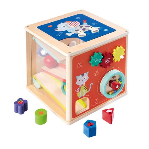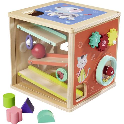 Binnenin de kubus vind je een vermakelijke knikkerbaan die door de transparante zijkant goed te volgen is, gecombineerd met een vormenstoof, draaiende tandwielen en een boeiend schuifspel. Door te spelen met deze activiteitenbox zal je kind spelenderwijs vormen, kleuren en oorzaak-gevolg leren ontdekken, terwijl tegelijkertijd de hand-oogcoördinatie en het logisch denkvermogen worden gestimuleerd.